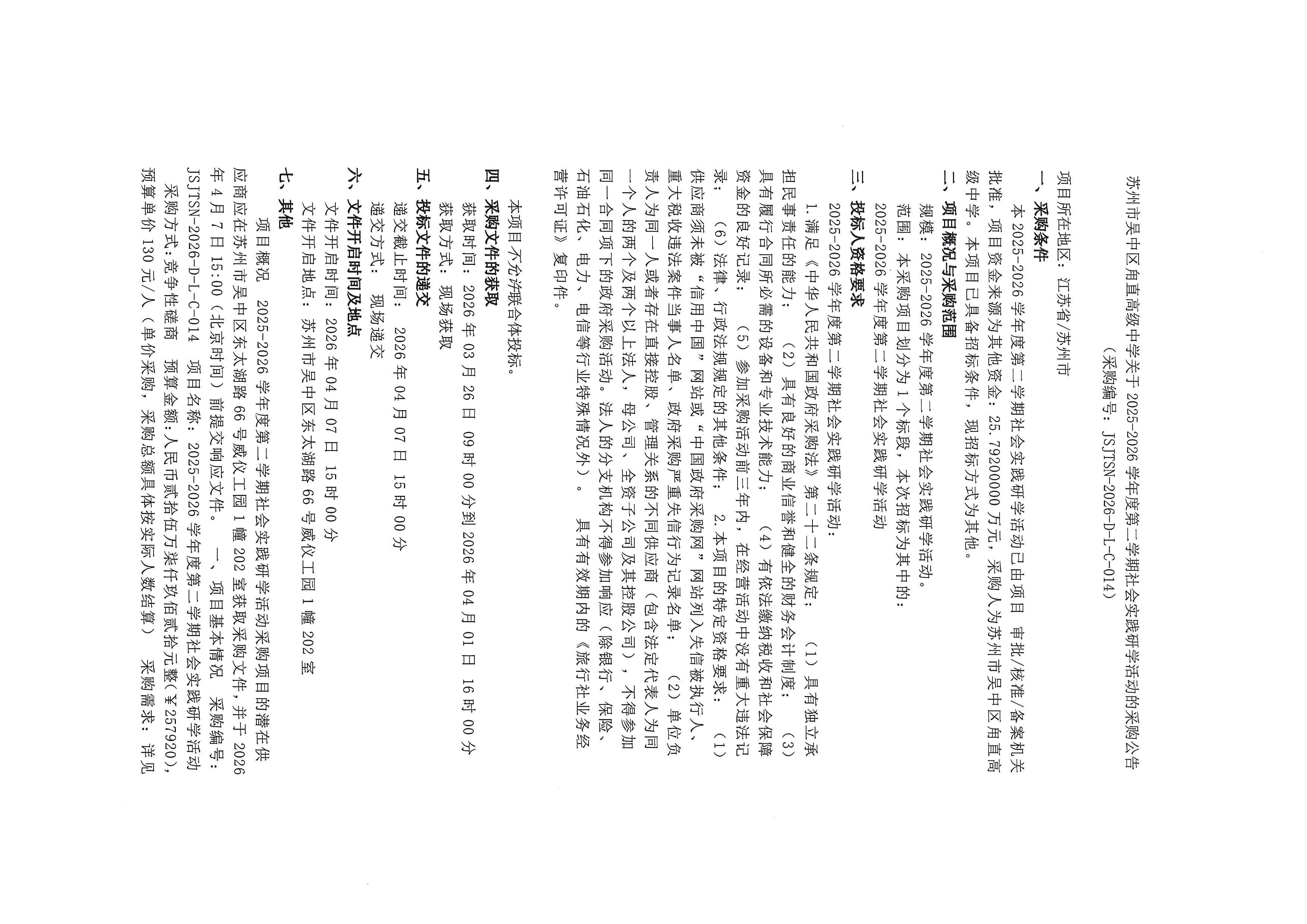 苏州市吴中区甪直高级中学关于2025-2026学年度第二学期社会实践研学活动的采购公告 来源: 发布时间:2026-03-26 08:56:13 浏览次数: 次 【字体:小 大】 分享到: 【打印正文】